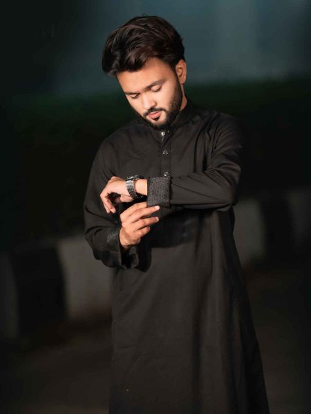 - The Panjabi is paired with off-white trousers, a classic choice for contrast and elegance.