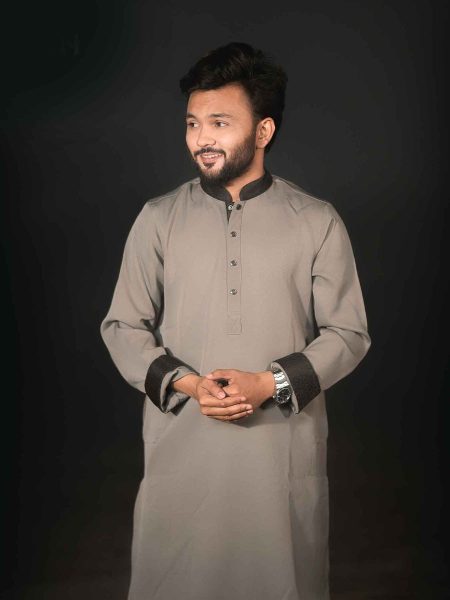 - The Panjabi is paired with off-white trousers, a classic choice for contrast and elegance.